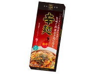 <乾麺物語/辛麺> めん(小麦粉(国内製造)、食塩/炭酸Ca、かんすい、クチナシ色素)、 スープ(たん白加水分解物、植物油脂、豆板醤、食塩、にんにく、ポークエキス、砂糖、ネギエキス、酵母エキスパウダー/調味料(アミノ酸等)、酒精、カラメル色素、香辛料抽出物、酸味料、ビタミンB1)、やくみ(唐辛子)、(一部に小麦・ごま・大豆・豚肉・ゼラチンを含む) |